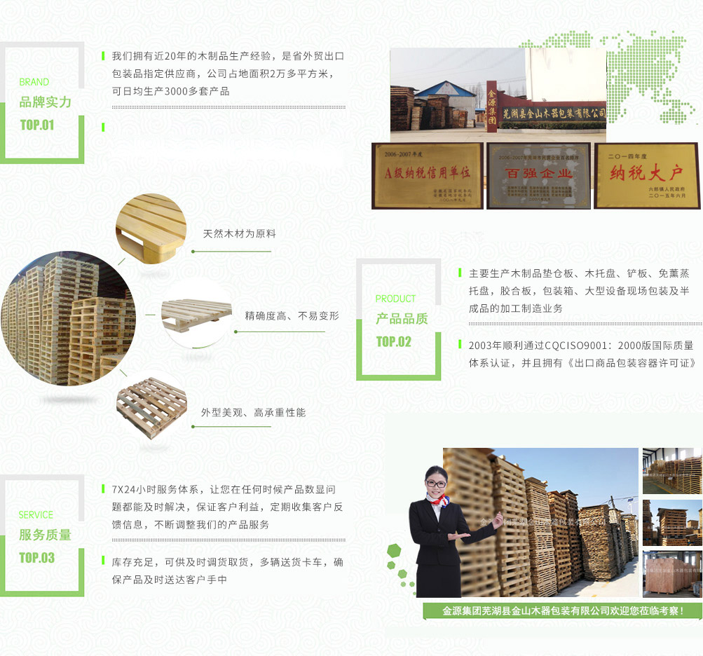 金源集團(tuán)蕪湖金山木器包裝有限公司是省外貿(mào)出口包裝品指定的供應(yīng)商,主要生產(chǎn)木制品墊倉板、木托盤、鏟板、免薰蒸托盤,膠合板,包裝箱、大型設(shè)備現(xiàn)場包裝及半成品的加工制造業(yè)務(wù)。產(chǎn)品廣泛用于物流,倉儲(chǔ),港口,碼頭,機(jī)械,建材,化工,紡織,食品,超市,五金電器等行業(yè)。公司占地面積2萬多平方米,注冊(cè)資金壹佰壹拾捌萬圓整,公司擁有員工160多人,其中技術(shù)人員占25%,可日均生產(chǎn)3000多套產(chǎn)品,年產(chǎn)值6000多萬元,公司下轄木材加工廠,組裝廠,并備有大型標(biāo)準(zhǔn)烘房,多功能平板刨,壓刨,挖槽,機(jī)械設(shè)備等。產(chǎn)品主要銷往國內(nèi)大中型城市并隨貨通行出口國外。